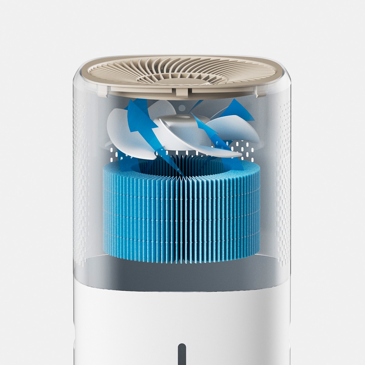 С помощью специальной помпы поступает вода и смачивает его, а вентилятор внутри прибора создаёт воздушный поток, который проходит через фильтр, обеспечивающий естественное испарение воды и увлажнение воздуха.