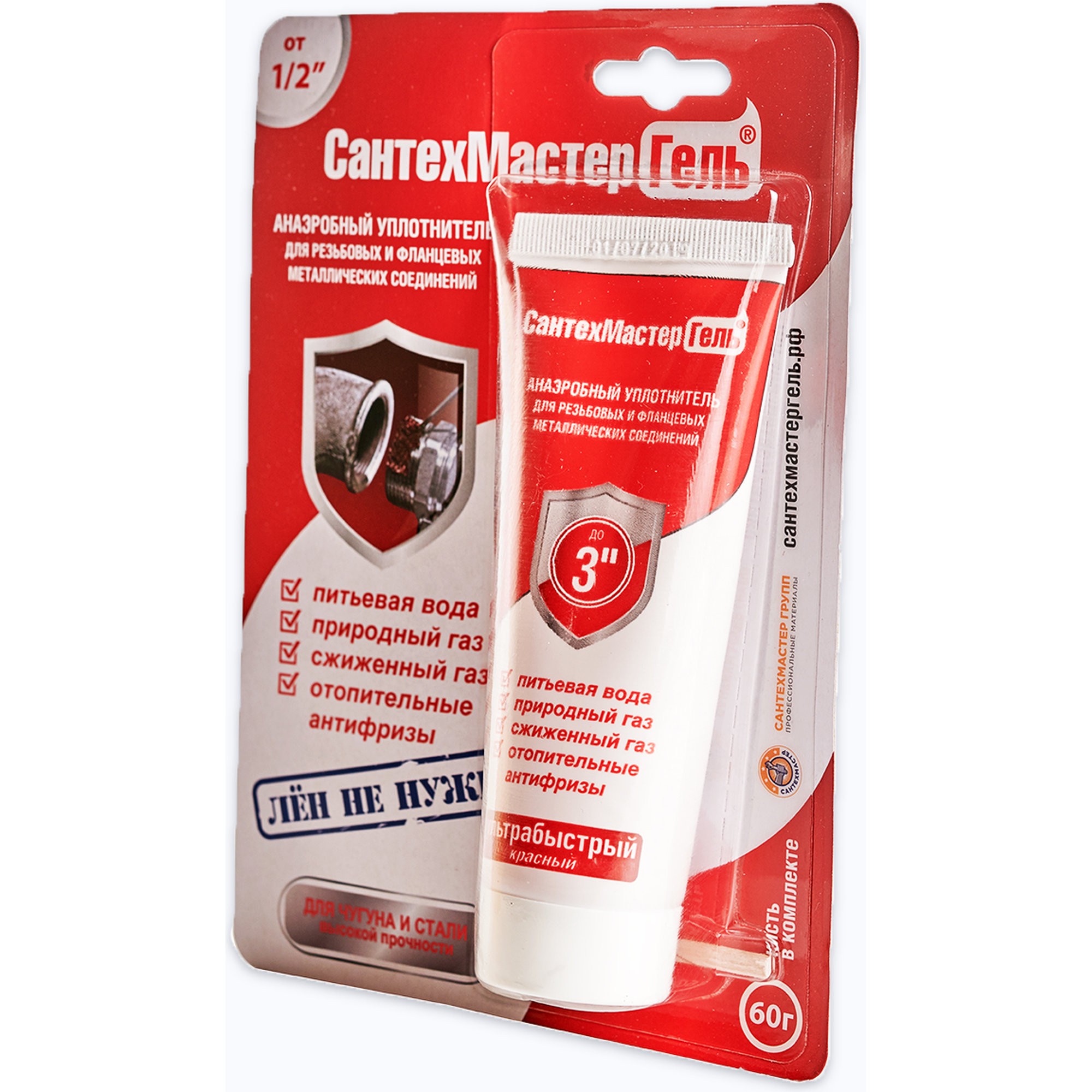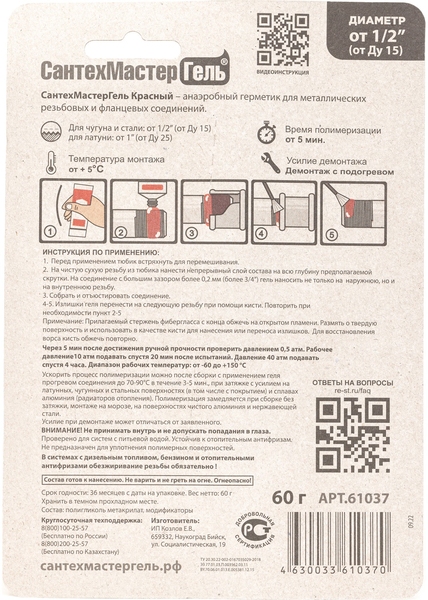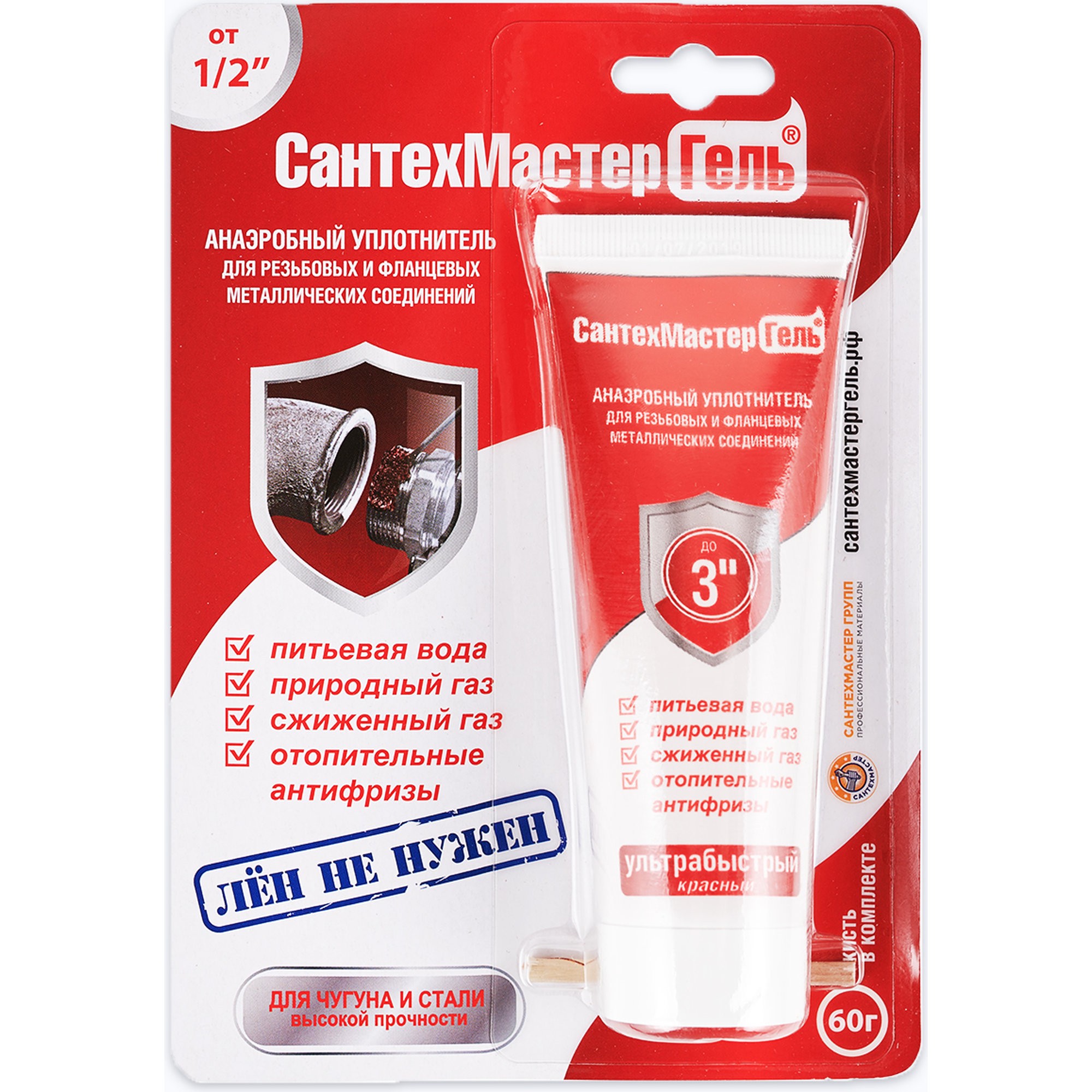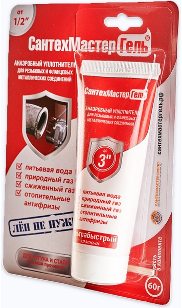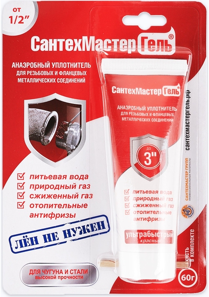 СантехМастер Гель Красный предназначен для резьбовых соединений от 1/2 "(дюйма) с зазором больше стандартного, такие как сталь, чугун и т.п. и от 1"(дюйма) для стандартных резьб.
