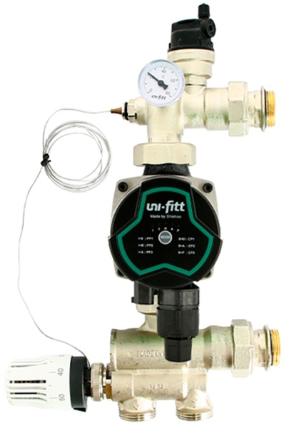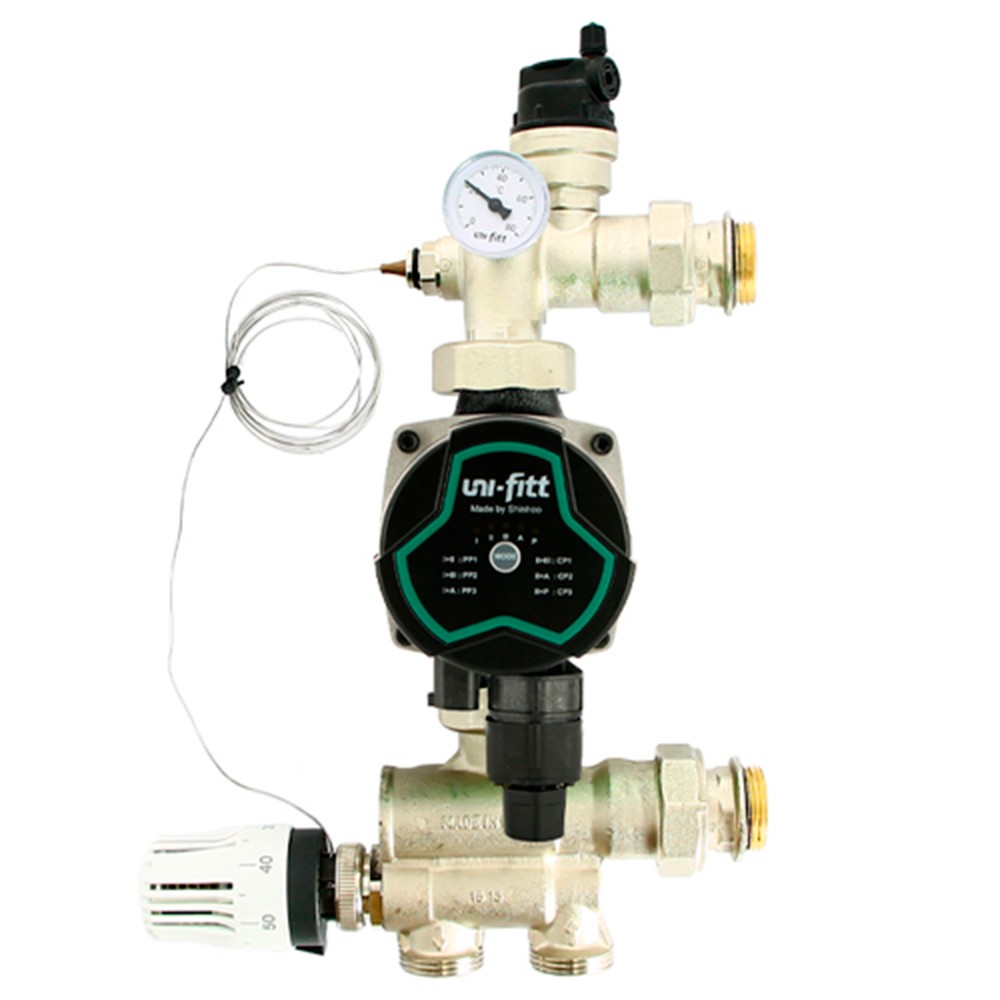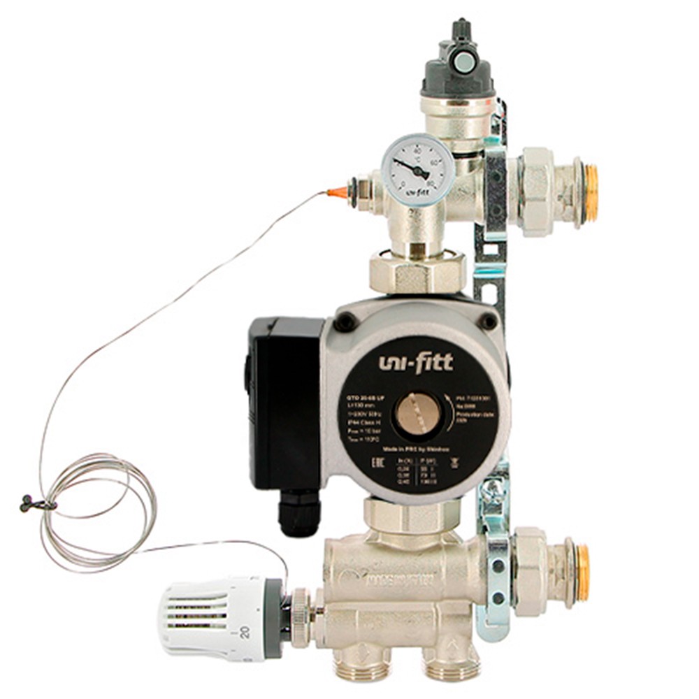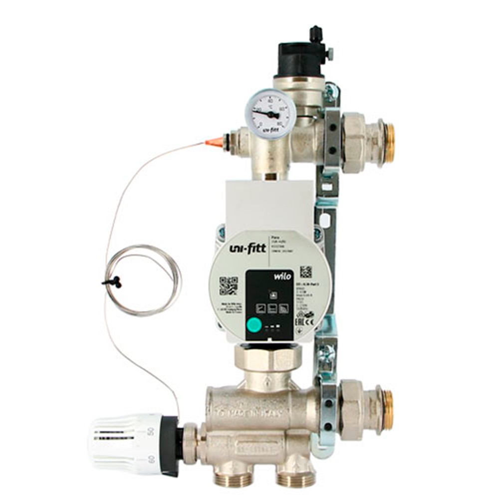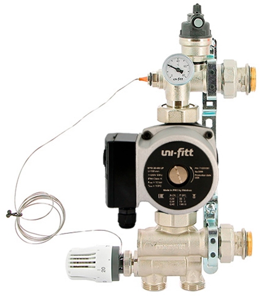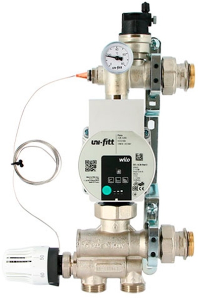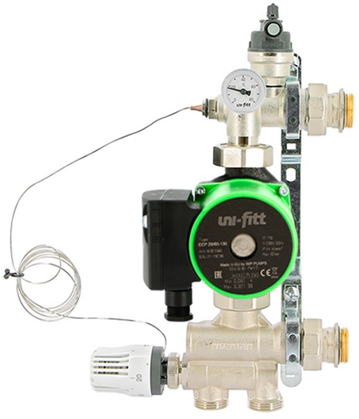 Группа насосно-смесительная Uni-Fitt предназначена для создания низкотемпературных систем отопления (типа «теплый пол»). Монтируется непосредственно на коллекторной группе низкотемпературного контура и подключается к высокотемпературному контуру системы отопления.