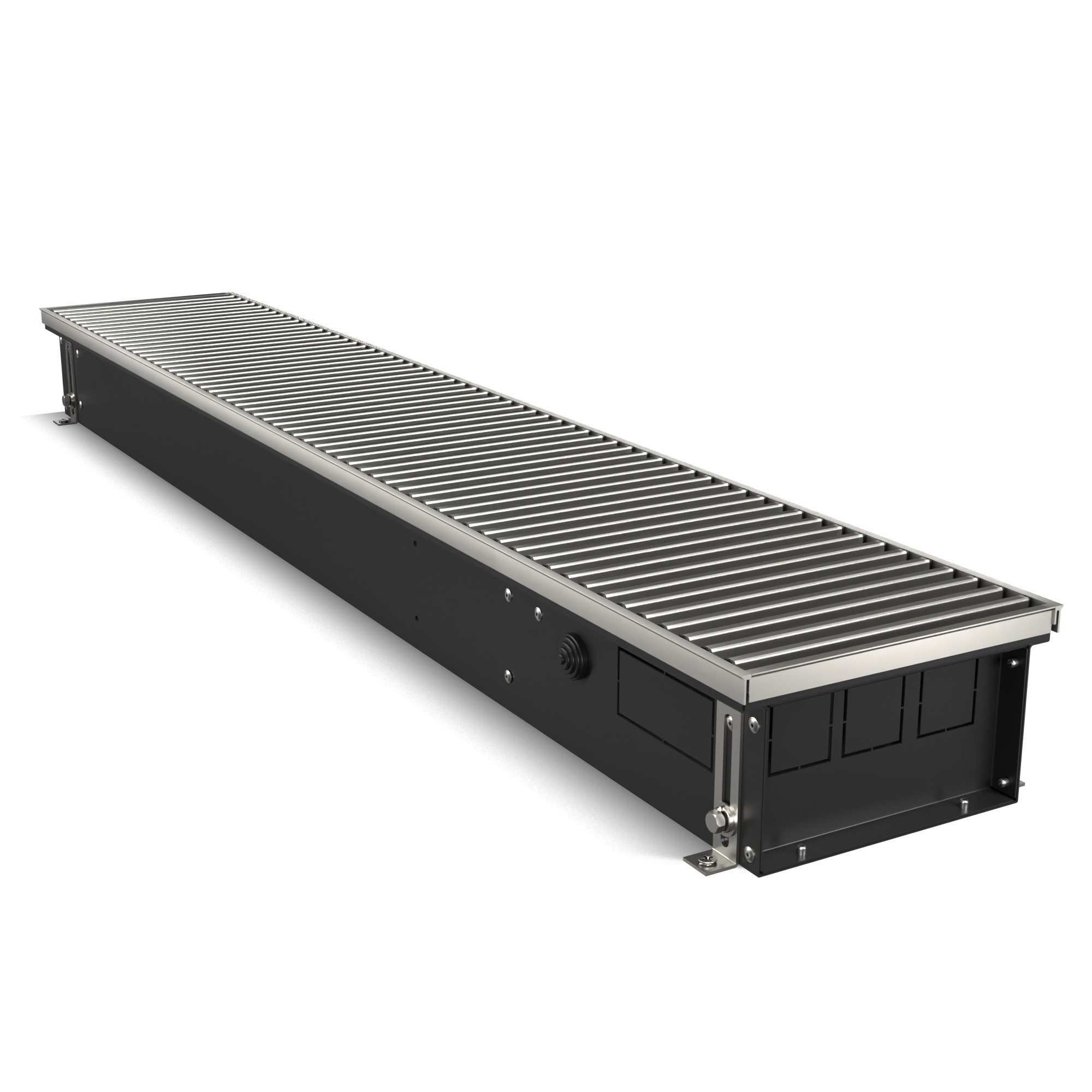 Корпус окрашен шагреневой краской AkzoNobel фирменного черного цвета Noir Sable. В такой же цвет окрашен теплообменник. Темная окраска корпуса изнутри и декоративные крышки, защищающие зону подключения и зону калача от попадания пыли и мусора, визуально скрывают внутреннюю часть, благодаря чему конвектор эстетично смотрится в интерьере.