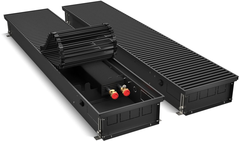 Корпус окрашен шагреневой краской AkzoNobel фирменного черного цвета Noir Sable. В такой же цвет окрашен теплообменник. Темная окраска корпуса изнутри и декоративные крышки, защищающие зону подключения и зону калача от попадания пыли и мусора, визуально скрывают внутреннюю часть, благодаря чему конвектор эстетично смотрится в интерьере.