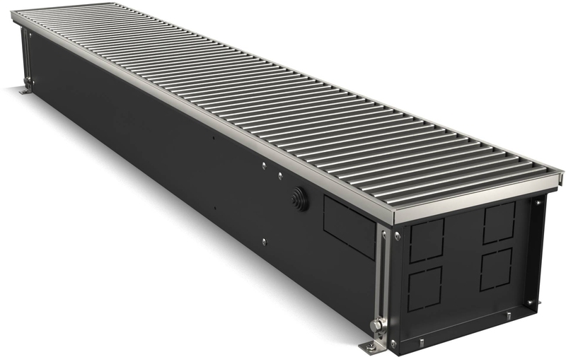 Корпус окрашен шагреневой краской AkzoNobel фирменного черного цвета Noir Sable. В такой же цвет окрашен теплообменник. Темная окраска корпуса изнутри и декоративные крышки, защищающие зону подключения и зону калача от попадания пыли и мусора, визуально скрывают внутреннюю часть, благодаря чему конвектор эстетично смотрится в интерьере.