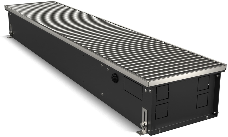 Корпус окрашен шагреневой краской AkzoNobel фирменного черного цвета Noir Sable. В такой же цвет окрашен теплообменник. Темная окраска корпуса изнутри и декоративные крышки, защищающие зону подключения и зону калача от попадания пыли и мусора, визуально скрывают внутреннюю часть, благодаря чему конвектор эстетично смотрится в интерьере.