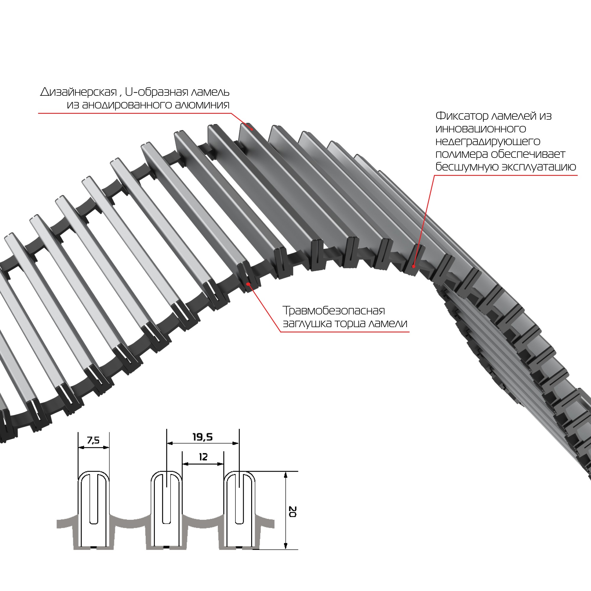 Фиксаторы ламелей решётки сделаны из инновационного недеградирующего полимера: такой пластик долговечен и не подвержен разрушению от воздействия ультрафиолета и перепадов температур. Высокоэластичные фиксаторы позволяют легко и компактно свернуть решётку, поэтому её удобно мыть даже в посудомоечной машине. А благодаря увеличенной высоте ламелей дизайнерская решётка выдерживает шаговую нагрузку более 250 кг. Решетка полностью ремонтопригодная: любую отдельную ламель можно вытащить из фиксаторов и заменить на новую, а анодирование алюминия обеспечивает долгий срок эксплуатации. Торцевые протекторы ламелей решётки защищают от травм, поэтому решётка полностью безопасна для детей и домашних питомцев.