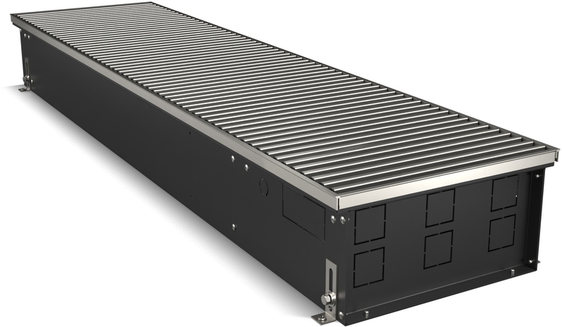 Корпус окрашен шагреневой краской AkzoNobel фирменного черного цвета Noir Sable. В такой же цвет окрашен теплообменник. Темная окраска корпуса изнутри и декоративные крышки, защищающие зону подключения и зону калача от попадания пыли и мусора, визуально скрывают внутреннюю часть, благодаря чему конвектор эстетично смотрится в интерьере.