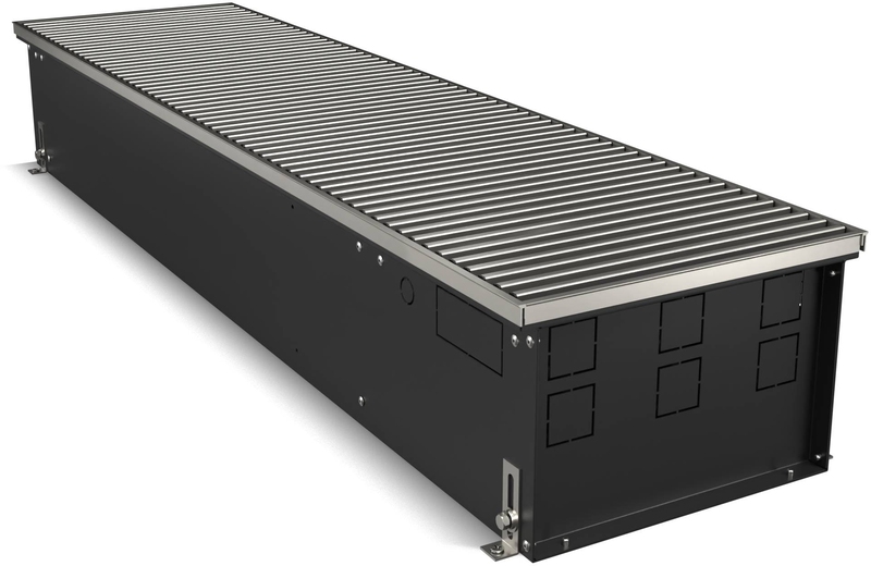 Корпус окрашен шагреневой краской AkzoNobel фирменного черного цвета Noir Sable. В такой же цвет окрашен теплообменник. Темная окраска корпуса изнутри и декоративные крышки, защищающие зону подключения и зону калача от попадания пыли и мусора, визуально скрывают внутреннюю часть, благодаря чему конвектор эстетично смотрится в интерьере.