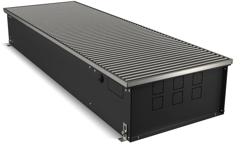 Корпус окрашен шагреневой краской AkzoNobel фирменного черного цвета Noir Sable. В такой же цвет окрашен теплообменник. Темная окраска корпуса изнутри и декоративные крышки, защищающие зону подключения и зону калача от попадания пыли и мусора, визуально скрывают внутреннюю часть, благодаря чему конвектор эстетично смотрится в интерьере.