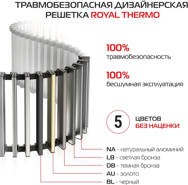 Травмобезопасная дизайнерская решётка премиум-класса выпускается в 5 цветах анодирования - натуральный алюминий, светлая и тёмная бронза, светлое золото и чёрный матовый. Конвекторы с цветом решетки Натуральный алюминий доступны к заказу со склада, остальные цвета под заказ без дополнительной наценки.