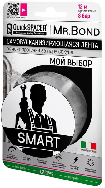 Самозаклеивающаяся силиконовая лента QS Mr.Bond® SMART, является профессиональным средством для оперативного ремонта в экстренных ситуациях. Эластичные свойства силиконовой ленты позволяют устранять технически сложные повреждения, благодаря повышенной прочности на разрыв.
