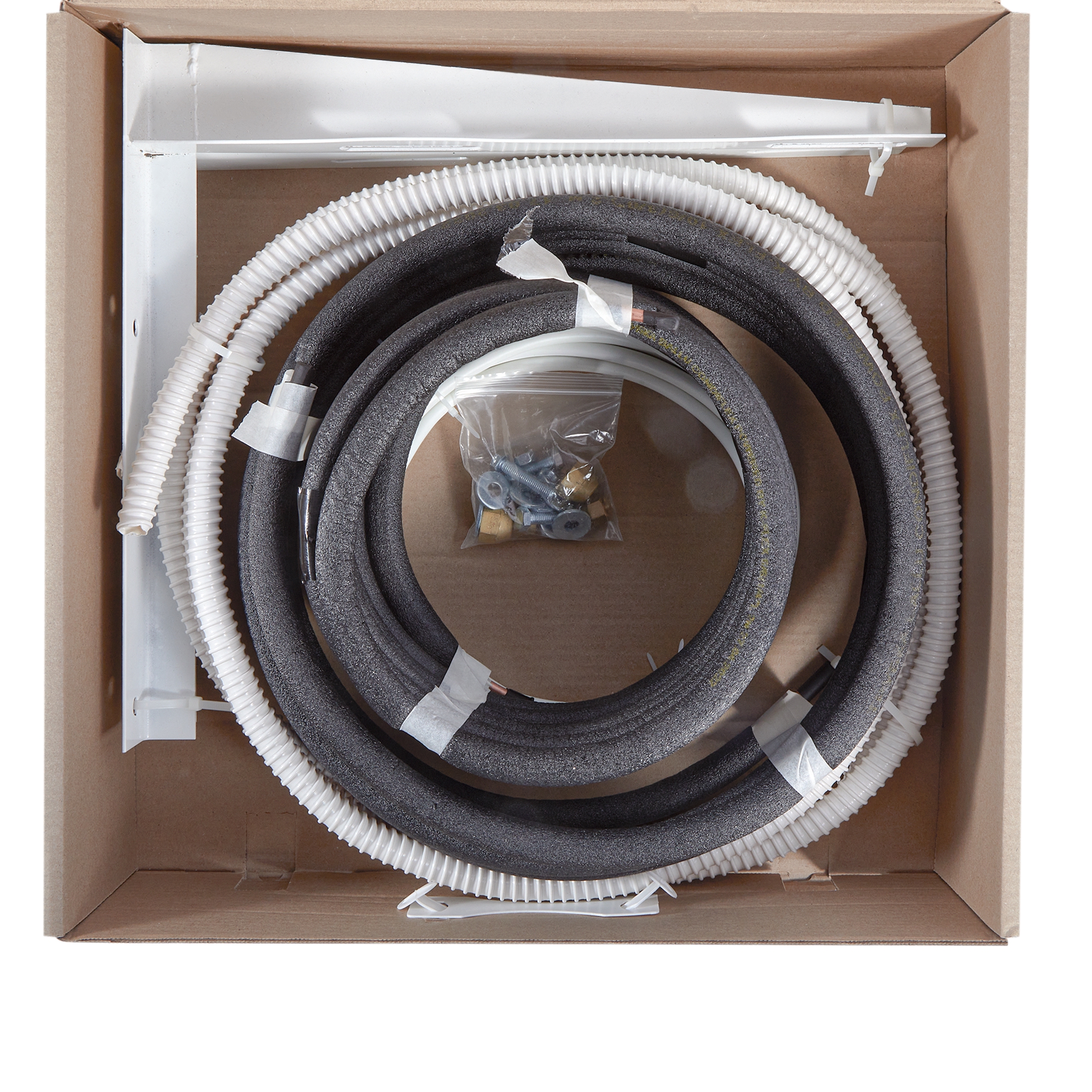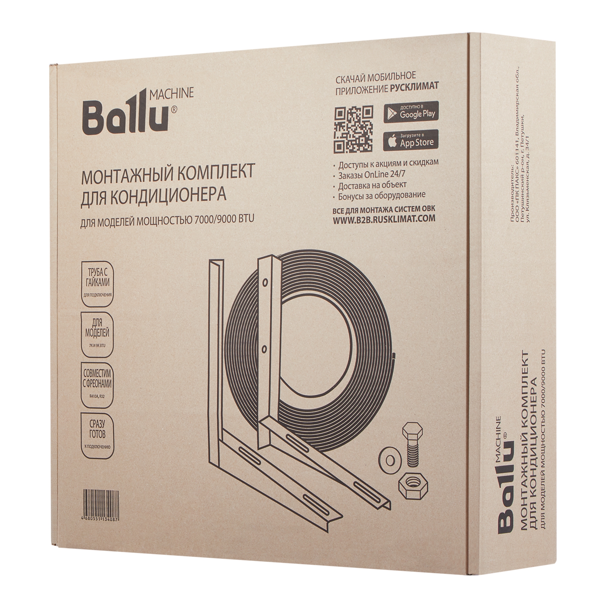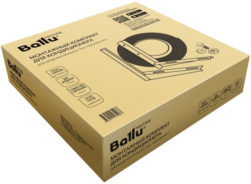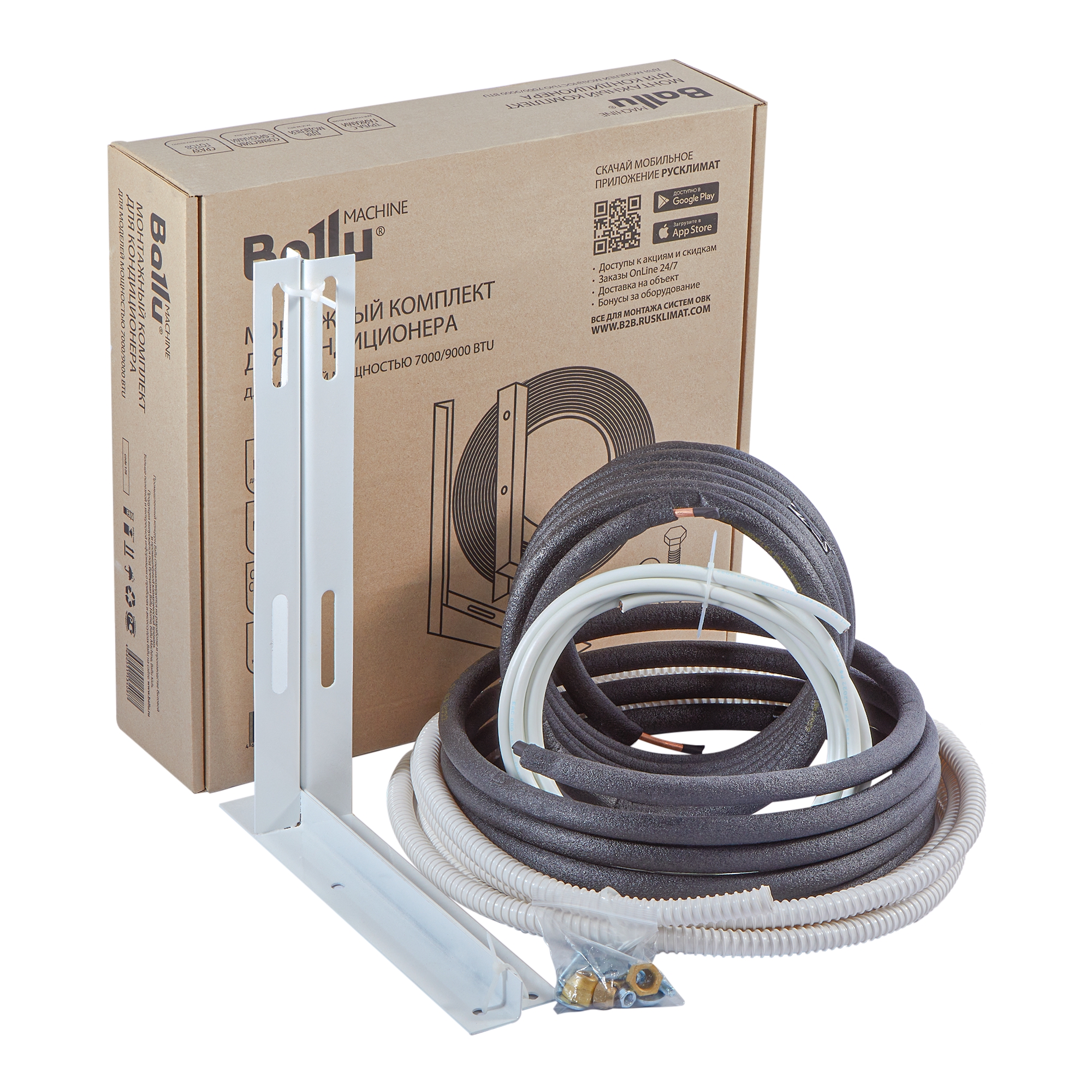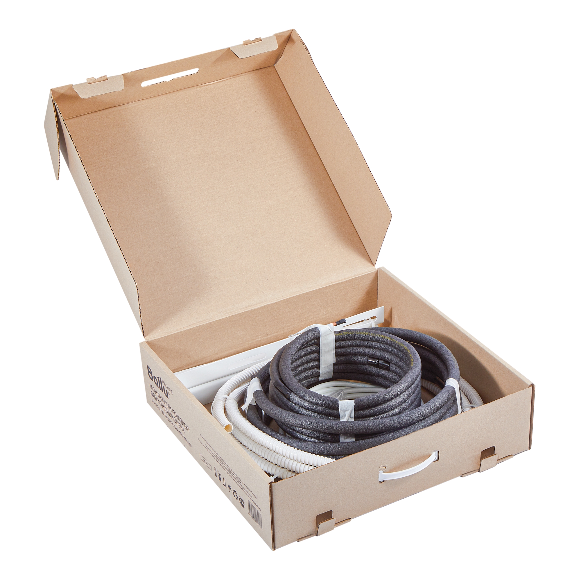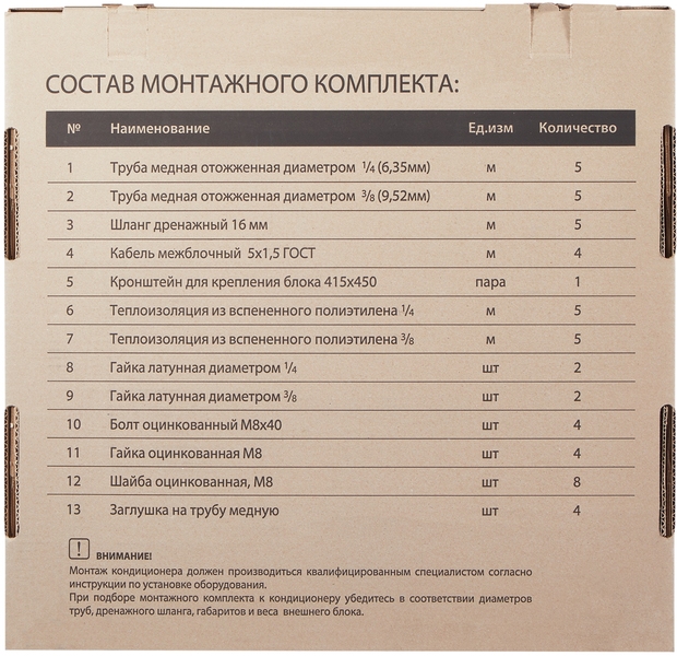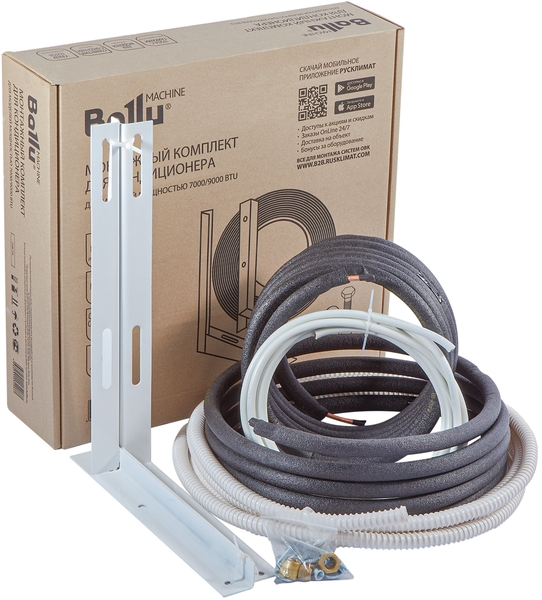 Комплект предназначен для кондиционеров 7000/9000 BTU, рассчитан на стандартную фреоновую трассу длиной 5м. Удобный кейс с ручкой включает в себя все необходимое: медную трубу в теплоизоляции, кронштейны, дренажный шланг, кабель, крепеж.