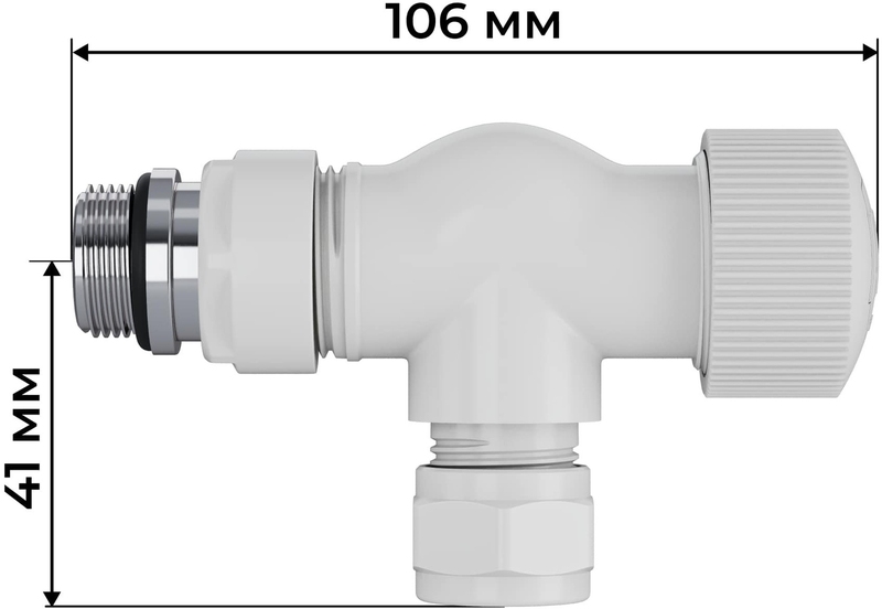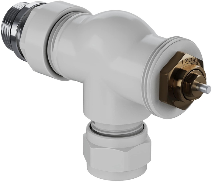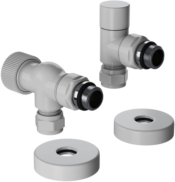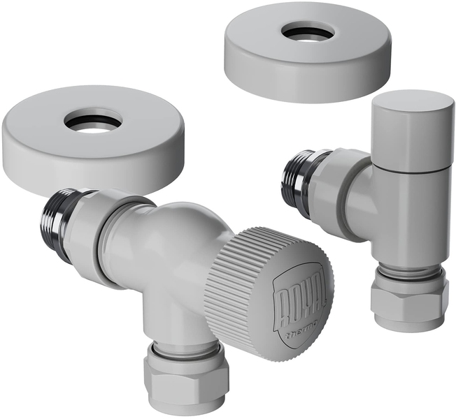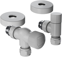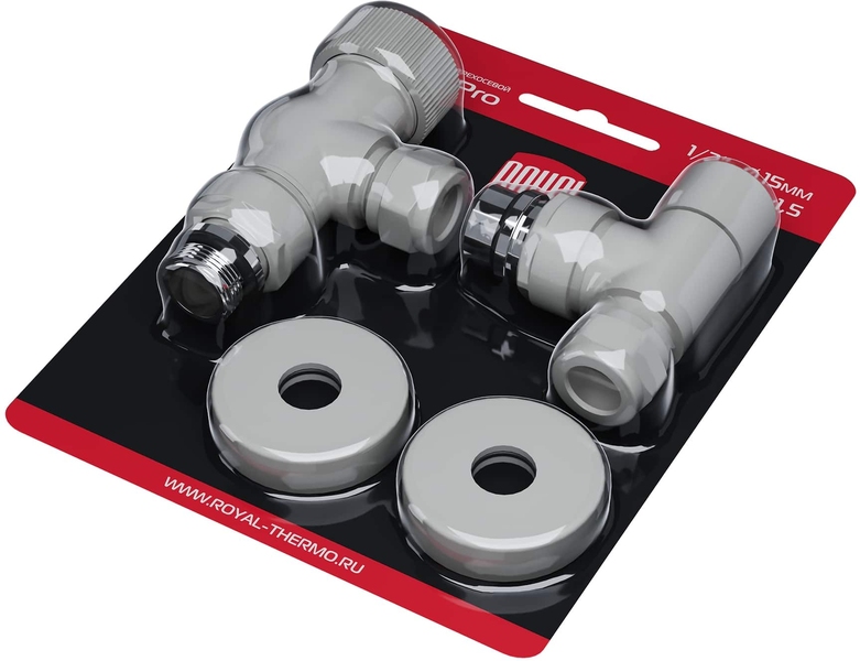 Термостатические наборы серии Design Pro поставляется в необходимой для чистового монтажа комплектации: клапан термостатический для установки на подающий трубопровод, запорный клапан для установки на обратный трубопровод, 2 гайки-фитинга для подключения клапанов к монтажной трубке 15 мм и 2 цельных латунных отражателя с внутренним резиновым уплотнением внутренним диаметром 15,2 мм.