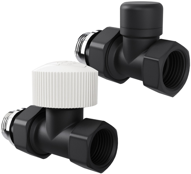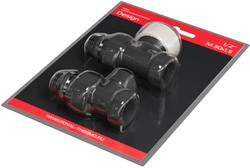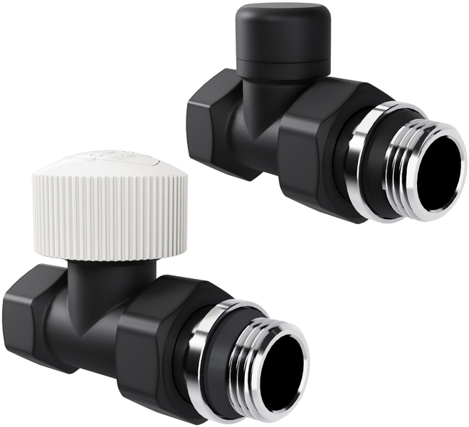Термостатические наборы серии Design поставляется в комплектации: клапан термостатический для установки на подающий трубопровод, запорный клапан для установки на обратный трубопровод.