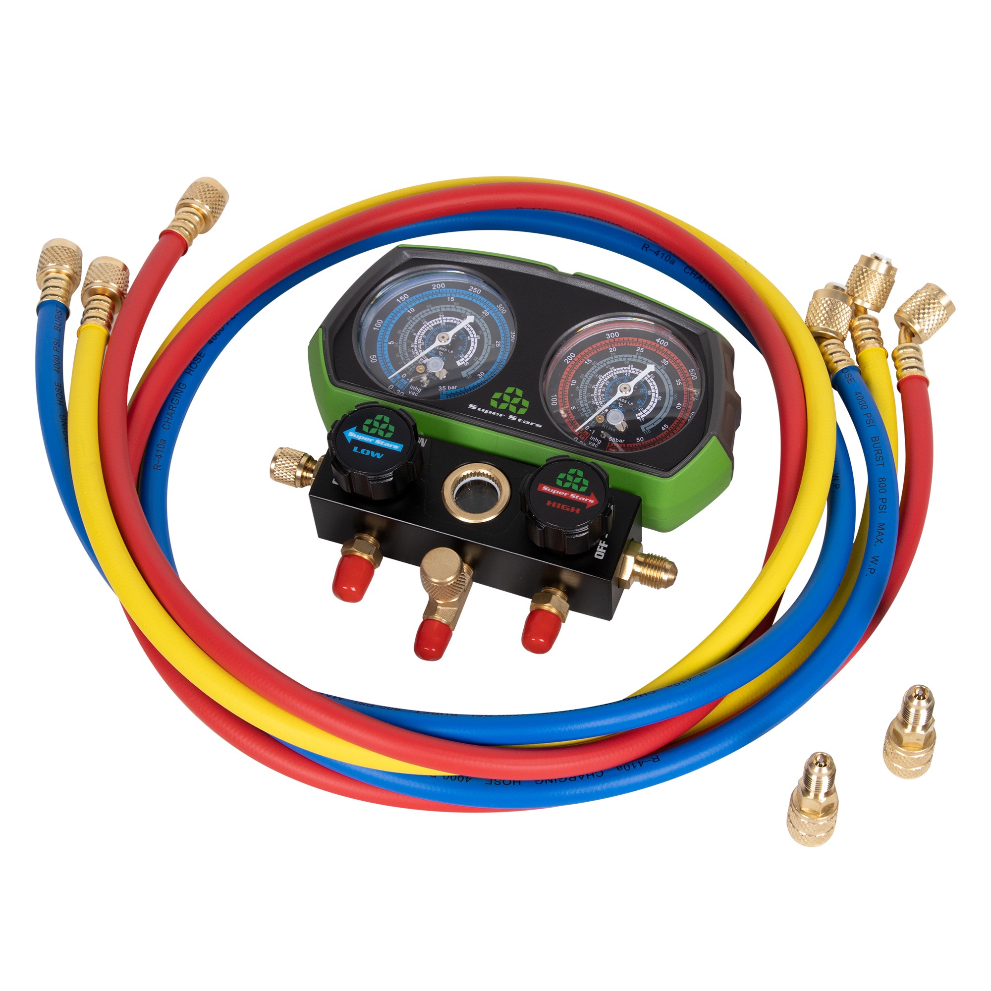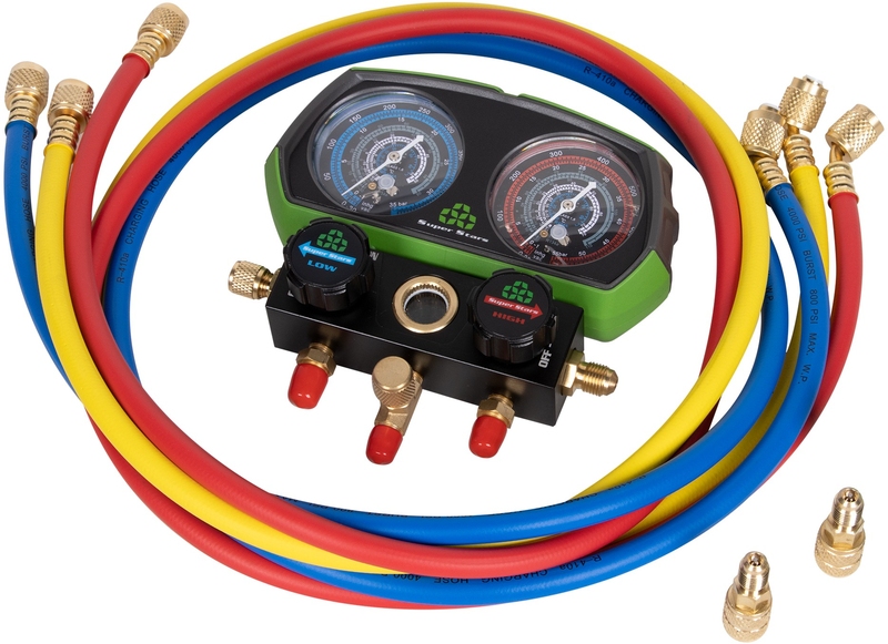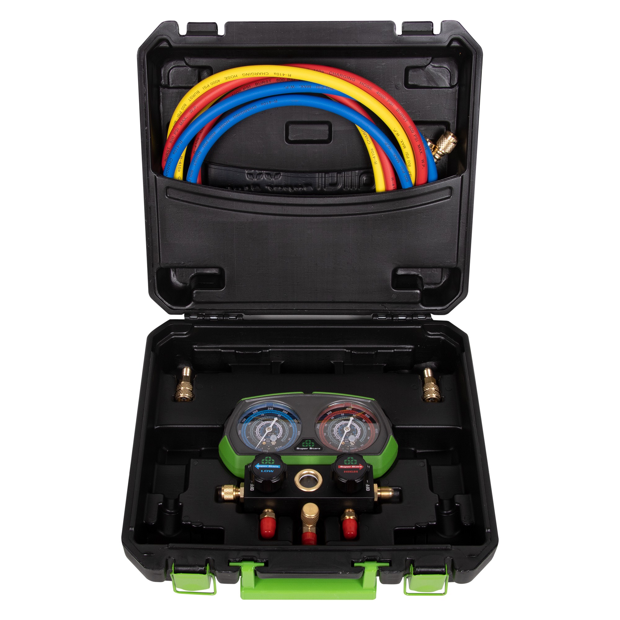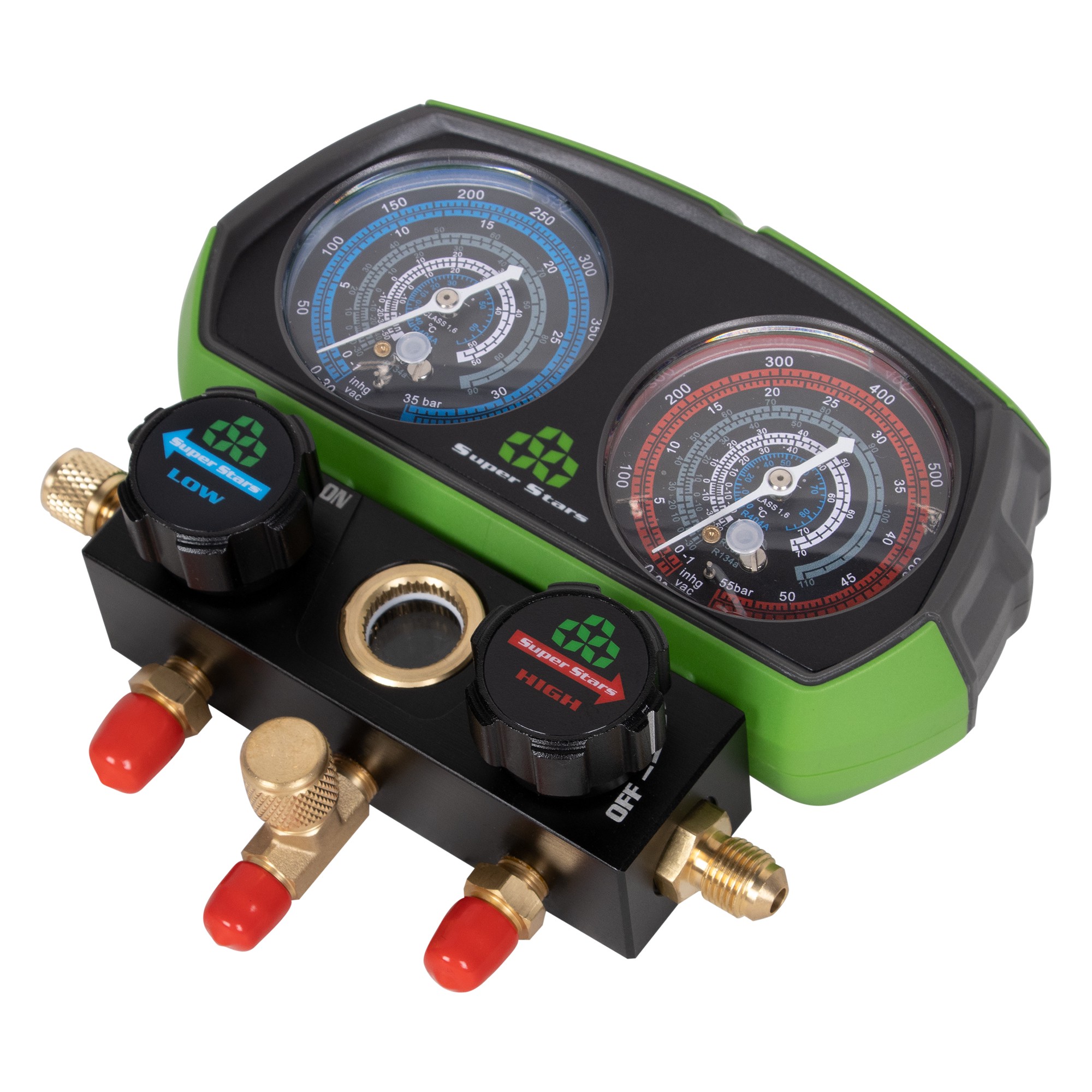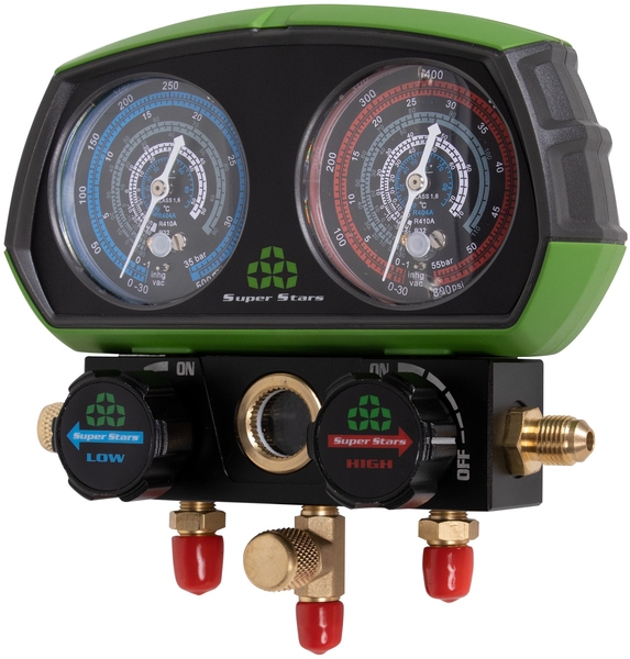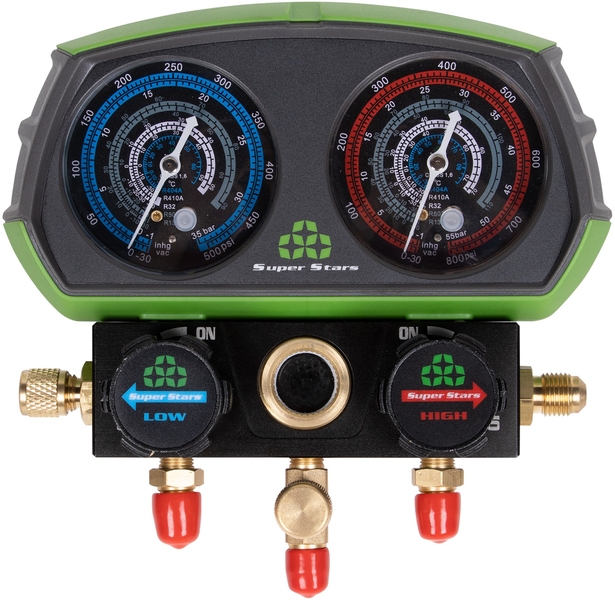 Станция манометрическая 2-х вентильная ST-B268D, используется для осуществления точного измерения давления внутри замкнутого контура трубопровода систем кондиционирования воздуха, холодильных установок. Подходит для хладагента R-410A.