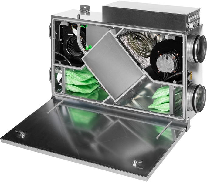 Очистка приточного воздуха происходит при помощи карманного фильтра класса EU5. Подогрев воздуха осуществляется при помощи электрического нагревателя. Для уменьшения энергопотребления используется высокоэффективный пластинчатый рекуператор с эффективностью до 75%.