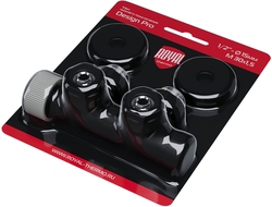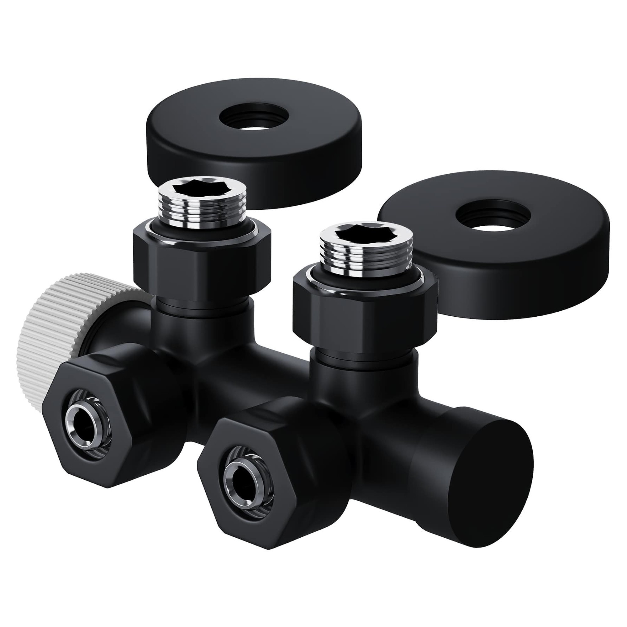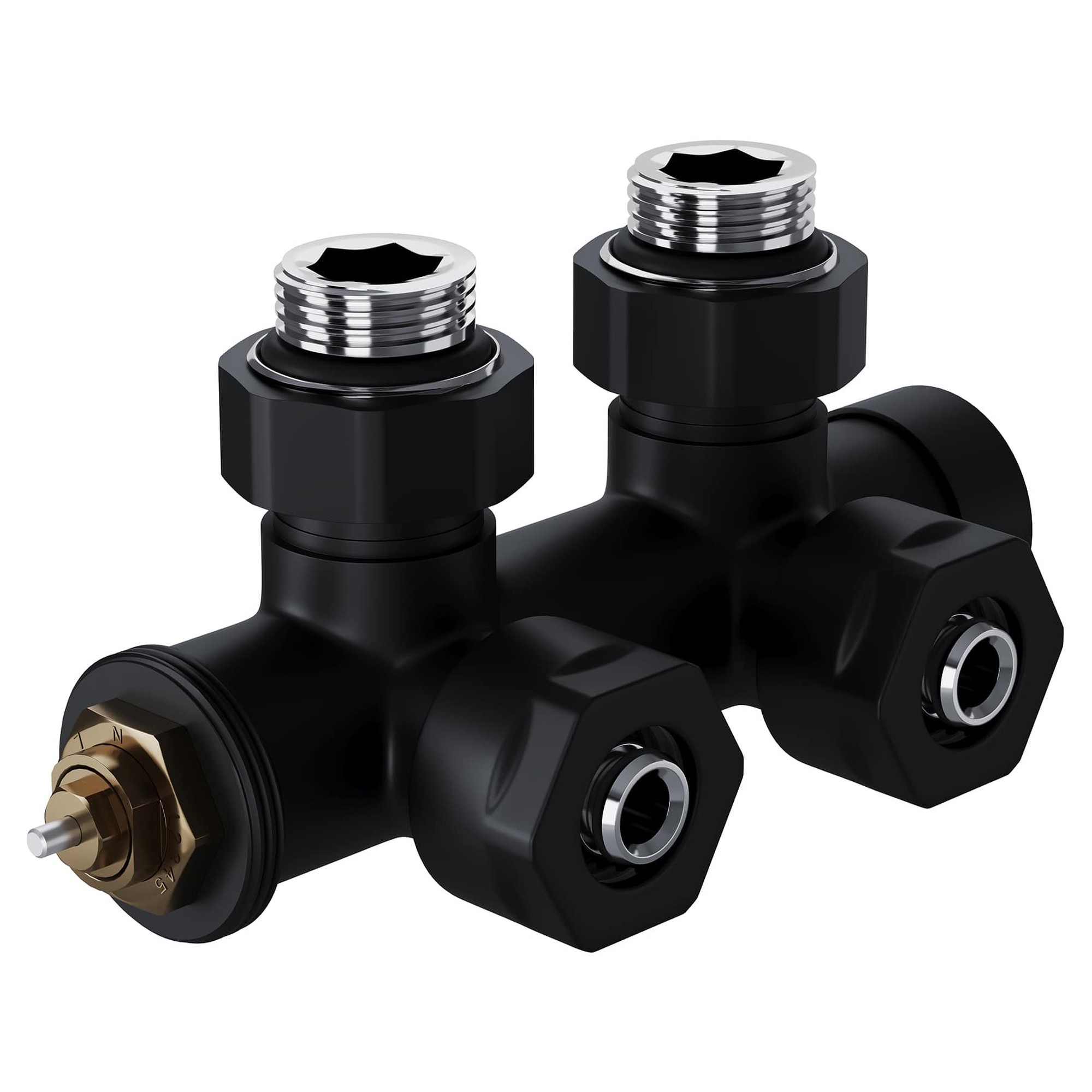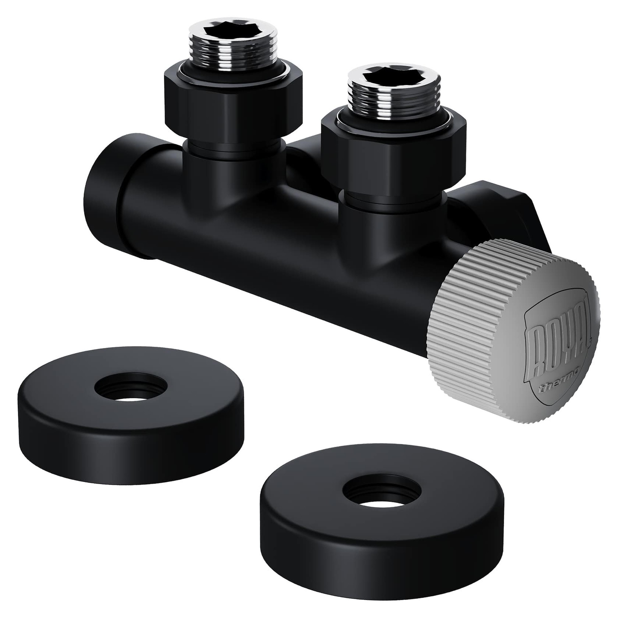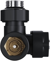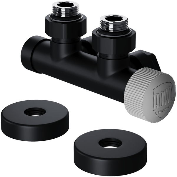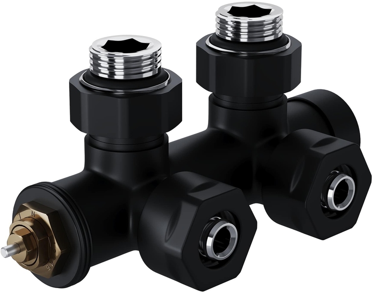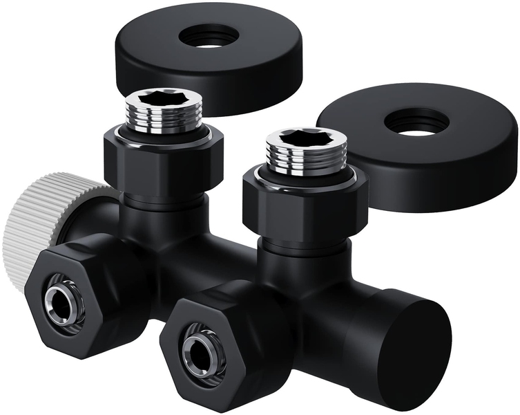 Узел нижнего подключения термостатический угловой серии Design Pro поставляется в необходимой для чистового монтажа комплектации: клапан термостатический для установки на подающий трубопровод, запорный клапан для установки на обратный трубопровод, 2 гайки-фитинга для подключения клапанов к монтажной трубке 15 мм и 2 цельных латунных отражателя с внутренним резиновым уплотнением внутренним диаметром 15,2 мм.