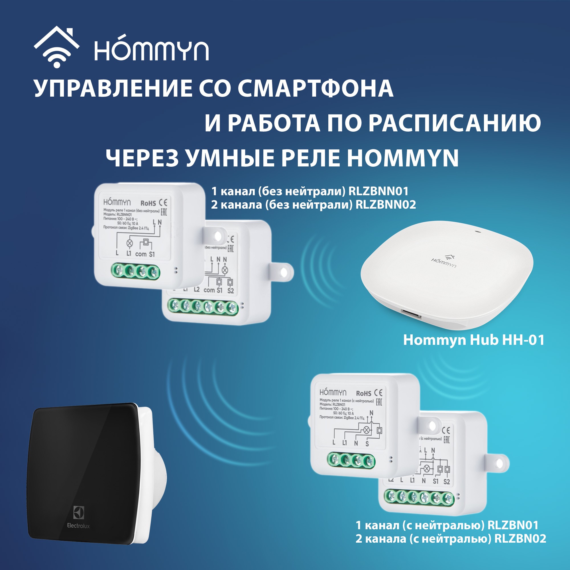 Для управления вытяжным вентилятором со смартфона и настройки работы по расписанию необходимо подключить его через умный выключатель или реле Hommyn! при необходимости установить Блок управления (шлюз) HOMMYN