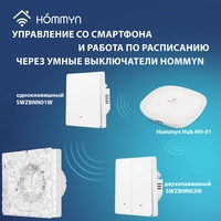 Для управления вытяжным вентилятором со смартфона и настройки работы по расписанию необходимо подключить его через умный выключатель или реле Hommyn! при необходимости установить Блок управления (шлюз) HOMMYN
