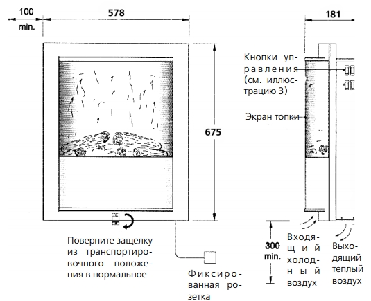 Устройство камина Dimplex Magic SP 8 рассчитана на постоянное крепление на стене при минимальной высоте 300 мм от пола, лучше всего горение в нижнем слое видно при установке электрокамина на уровне 600 мм от пола до нижней части корпуса прибора.