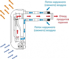 Камера сгорания закрытого типа, используемая в конвекторе Alpine Air NGS-30 F, полностью изолирована от воздуха внутри помещения. Забор воздуха для работы горелки и отвод продуктов сгорания наружу помещения осуществляется через горизонтальную телескопическую трубу, подсоединяемую с обратной стороны конвектора. То есть, конвектору не нужен традиционный дымоход. Телескопическая труба имеет коаксиальную конструкцию - по внутренней части отводятся продукты горения, а по внешней идет приток воздуха снаружи. При этом отводимые газы разогревают поступающий воздух, в зимний период это способствует более полному сгоранию топлива.