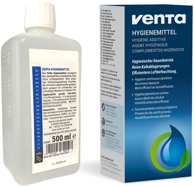 Venta-гигиеническая добавка предназначен для предотвращения “цветения” воды в приборах Venta. Поэтому накапливающиеся в воде прибора частицы пыли из воздуха, пыльца растений, шерсть животных и текстильные волокна не разлагаются и не приводят к “цветению” воды, а вредные газы и формальдегиды при этом не образуются.