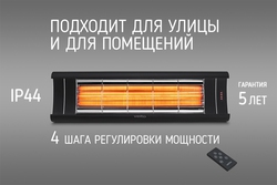 Класс защиты - IP44, это означает, что вы можете использовать обогреватель для установке на террасе, местах для курения, в зимних садах, ресторанах и отелях.