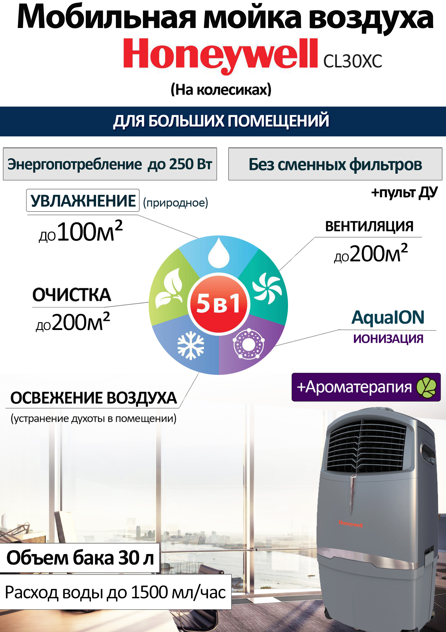 Комплекс Honeywell CL30XC создает прятный, увлажненный и очищенный воздух, с одновременным овеиванием всего пространства, устраняя от примесей, пыльцы, шерсти и других аллергенов!