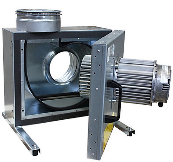 Конструкция: Корпус выполнен из двух листов оцинкованной листовой стали и изолирован слоем минеральной ваты толщиной 50 мм. Вентиляторы KBT имеют откидную дверцу для удобства осмотра и обслуживания. Направление открытия дверцы можно менять с левого на правое. Вентилятор изолирован от корпуса с помощью соединителей, виброгасители встроены в несущую раму.