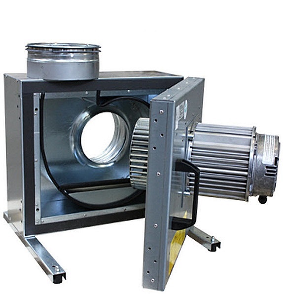 Конструкция: Корпус выполнен из двух листов оцинкованной листовой стали и изолирован слоем минеральной ваты толщиной 50 мм. Вентиляторы KBT имеют откидную дверцу для удобства осмотра и обслуживания. Направление открытия дверцы можно менять с левого на правое. Вентилятор изолирован от корпуса с помощью соединителей, виброгасители встроены в несущую раму.