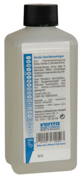 Очиститель для прибора Venta не имеет цвета и запаха, не вызывает коррозии и не наносит вреда окружающей среде.
