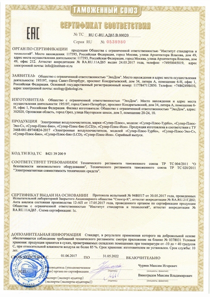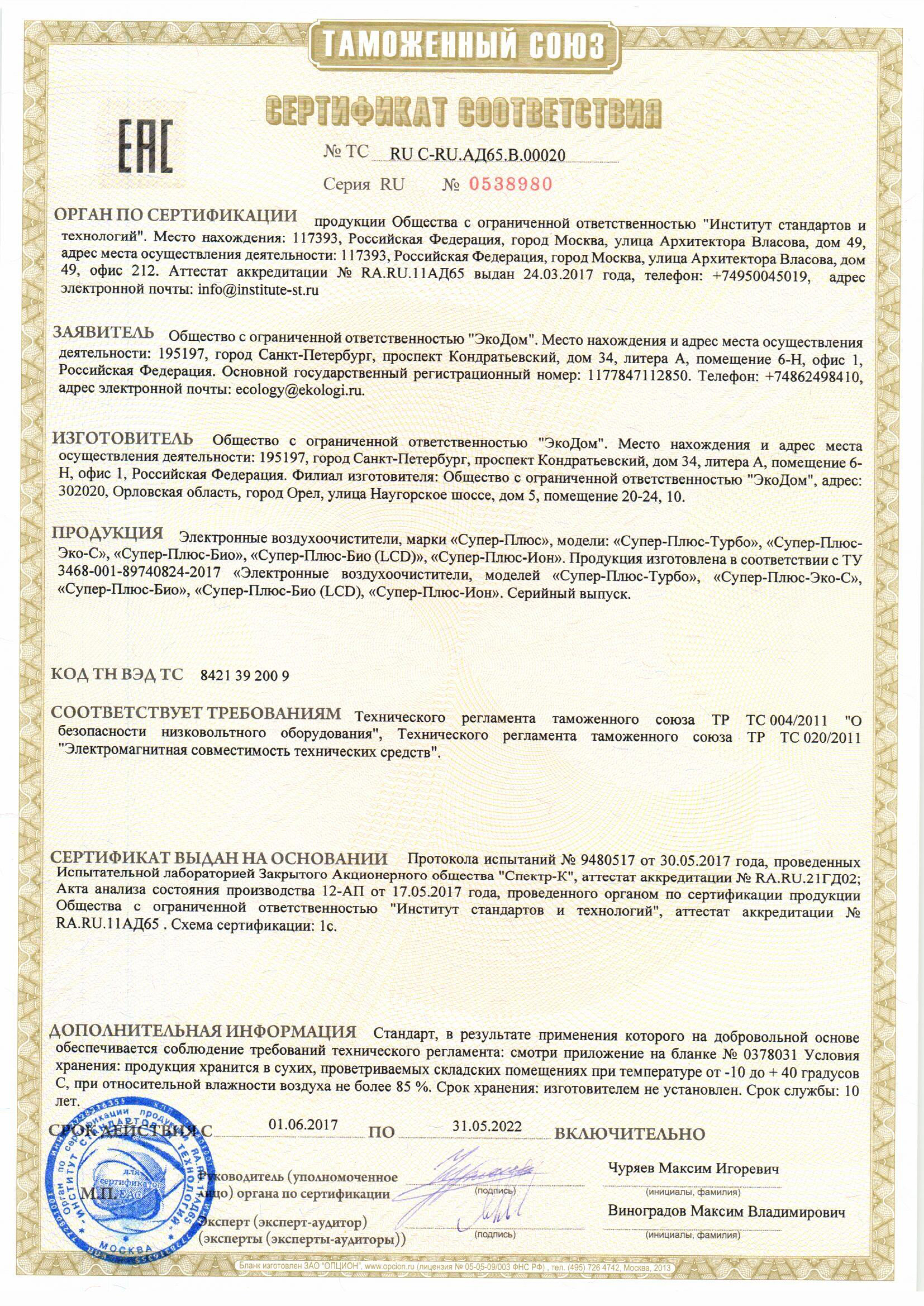 Прибор ионизатор воздуха СУПЕР ПЛЮС ТУРБО разрабатывался не только для российского, но и для зарубежных рынков с учетом западных стандартов безопасности и качества. В частности, сертификацию проходило не только само изделие. Процесс производства был также сертифицирован по ИСО 9001 и уже сейчас начаты поставки в/о СУПЕР ПЛЮС ТУРБО в Европу, Америку и Японию.