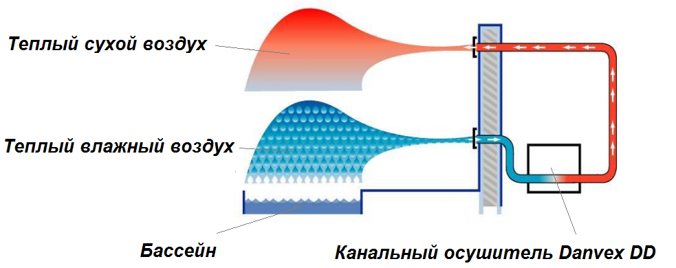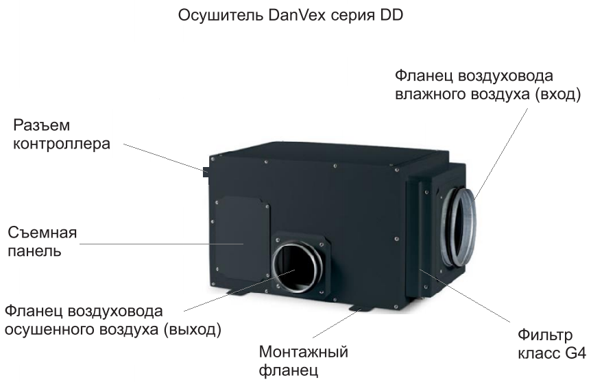 Канальные осушители воздуха DanVex серии DD. Осушители этой серии работают на основе метода конденсации влаги из воздуха и предназначены для осушения воздуха, подаваемого через воздуховоды. Осушители могут использоваться как самостоятельные установки (т.к. имеют в составе напорный вентилятор), так и в составе вентиляционной системы.