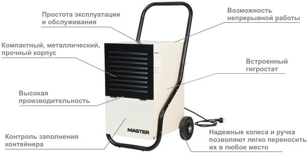 Осушитель воздуха Master DH 752 находит применение в различного рода помещениях. Использование этого типа конденсаторных осушителей может ускорить проведение многих отделочных и ремонтных работ.