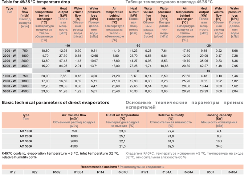 Таблица температурного перепада 45/35°C и Основные технические параметры прямых испарителей