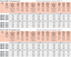 Таблица температурного перепада 45/35°C и Основные технические параметры прямых испарителей