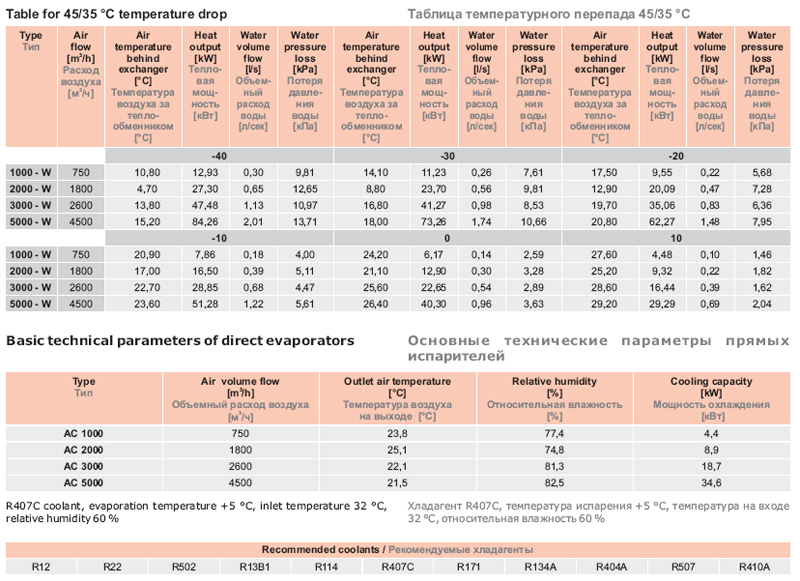 Таблица температурного перепада 45/35°C и Основные технические параметры прямых испарителей