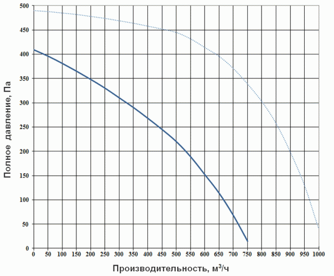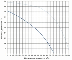 Вентилятор имеет запас по производительности / напору (показано на графике вентиляционных характеристик тонкой линией), настройку производительности можно делать со штатного пульта, регулируя максимальное управляющее напряжение на вентиляторе.