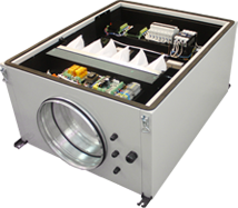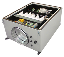 Технологичность установки видна во всем даже с первого взгляда. К примеру, прижимное устройство крепления пылевого фильтра позволяет быстро установить фильтрующий элемент с помощью двух кнопок, после чего проход даже малейшего количества неочищенного приточного воздуха минуя фильтр, становится невозможным. Корпус установки абсолютно герметичен и теплоизолирован, не имеет тепломостов даже в местах соединения основных панелей. Класс защиты (IP-44). Для безопасности обслуживания в прибор встроены автоматы эл. отключения и кнопка ручного принудительного обесточивания всей установки. Контрольные датчики температуры находятся внутри корпуса установки и уже подключены к системе управления. Датчик состояния пылевого фильтра подает сигнал на пульт дистанционного управления при необходимости замены фильтрующего элемента. Воздушный клапан герметичен и оснащен эл. приводом с возвратной пружиной, закрывающей клапан в случае отключения эл. энергии воизбежание выхолаживания помещения. Для нагрева приточного воздуха используются керамические полупроводниковые нагреватели, пожаробезопасные и не сжигающие кислород в приточном воздухе. Хорошо сбалансированный вентилятор имеет встроенные амортизаторы, тем самым снижая и без того невысокий уровень шума.