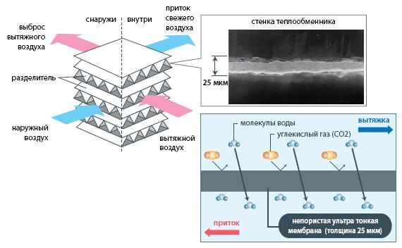 приточный воздух охлаждается и осушается летом, а также нагревается и увлажняется зимой за счет вытяжного воздуха. Материал рекуператора имеет избирательную проницаемость к различным газам, что обеспечивает свободное прохождение водяного пара и препятствует прониканию загрязняющих веществ (углекислый газ, аммиак) через стенки теплообменника.