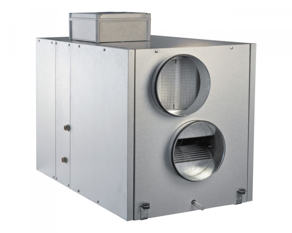 Приточно-вытяжная установка в звуко- и теплоизолированном корпусе с водяным нагревателем. Максимальная производительность - 1100 м3 ч.