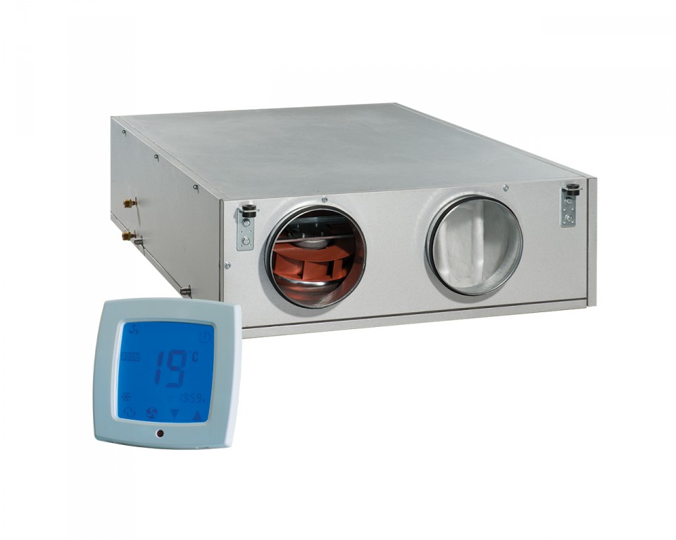 Компактная подвесная приточно-вытяжная установка в звуко- и теплоизолированном корпусе с водяным нагревателем. Максимальная производительность - 3800 м3/ч.