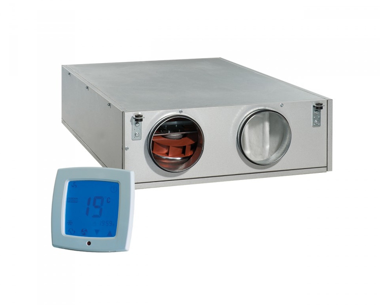 Компактная подвесная приточно-вытяжная установка в звуко- и теплоизолированном корпусе с электронагревателем. Максимальная производительность - 350 м3/ч.