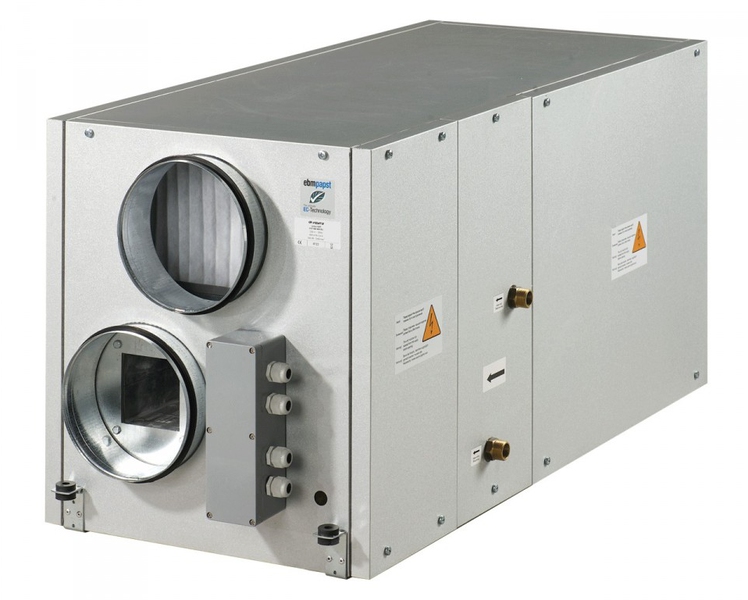 Приточно-вытяжная установка в звуко- и теплоизолированном корпусе с водяным нагревателем. Максимальная производительность - 400 м3/ч.