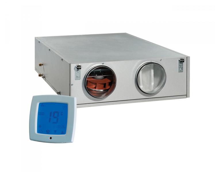 Компактная подвесная приточно-вытяжная установка в звуко- и теплоизолированном корпусе с водяным нагревателем. Максимальная производительность - 600 м3/ч.