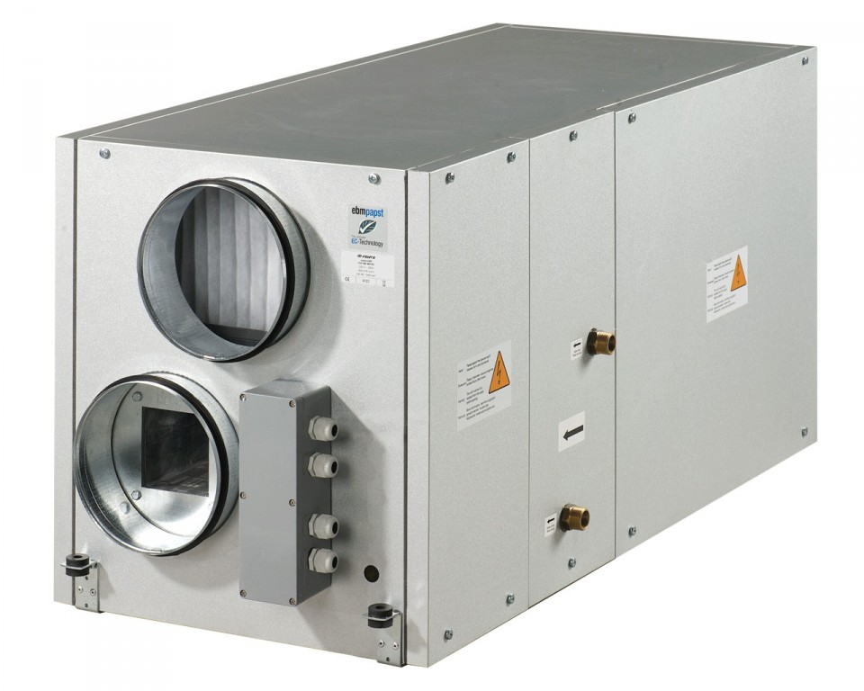 Приточно-вытяжная установка в звуко- и теплоизолированном корпусе с водяным нагревателем. Максимальная производительность - 550 м3/ч.