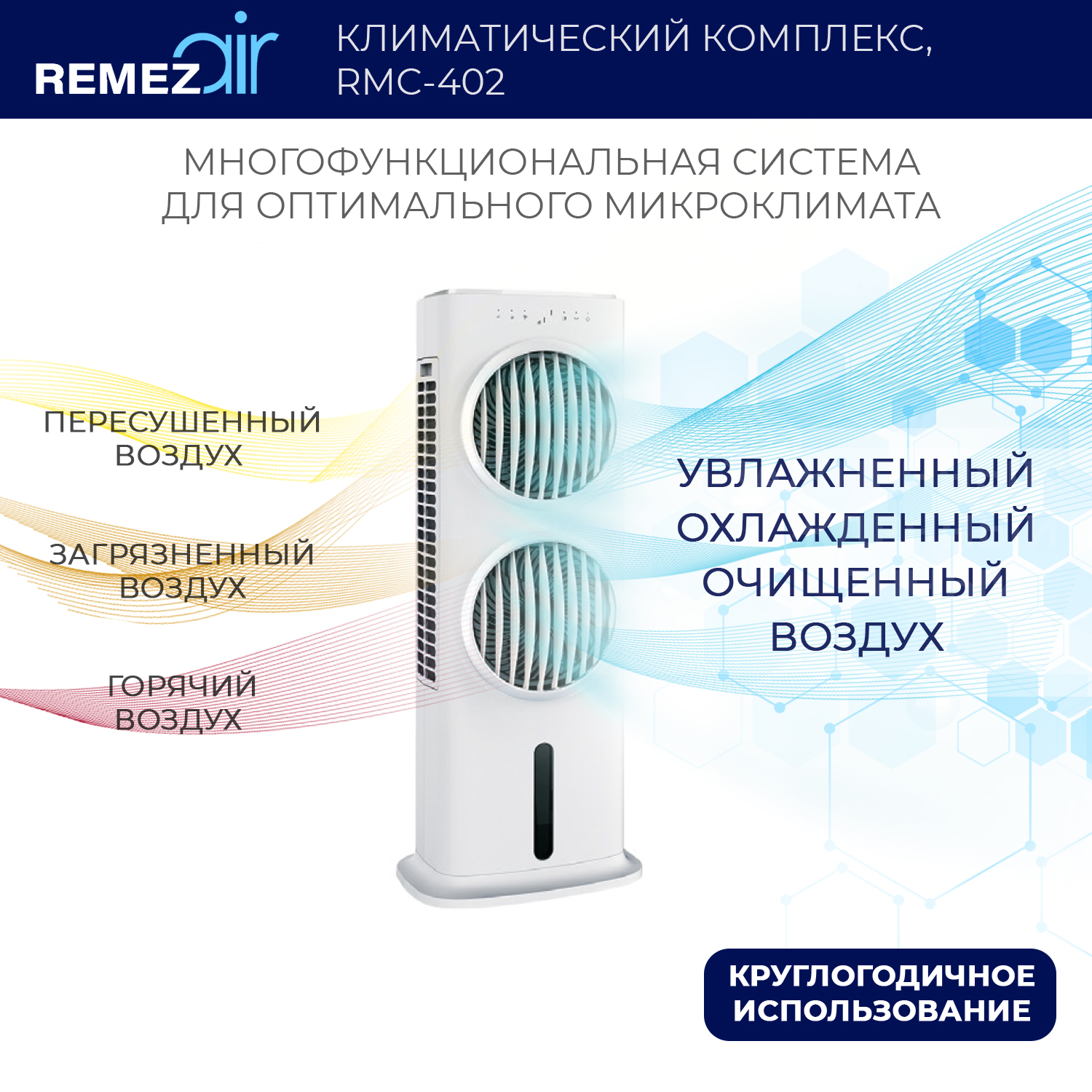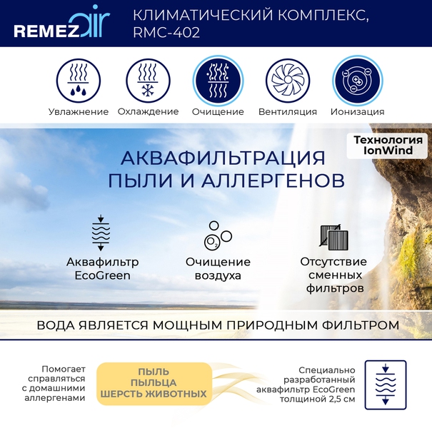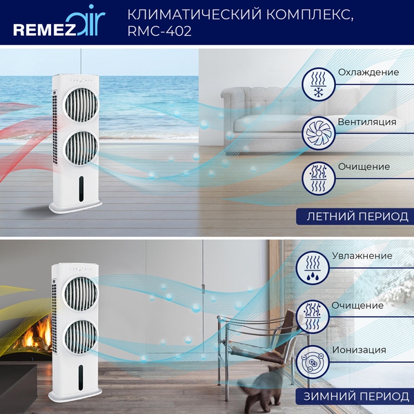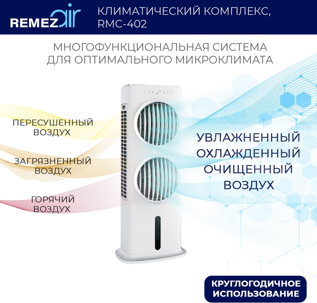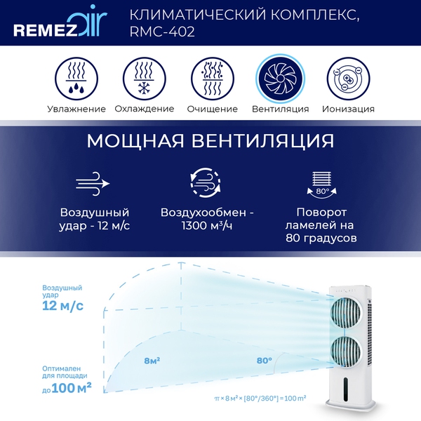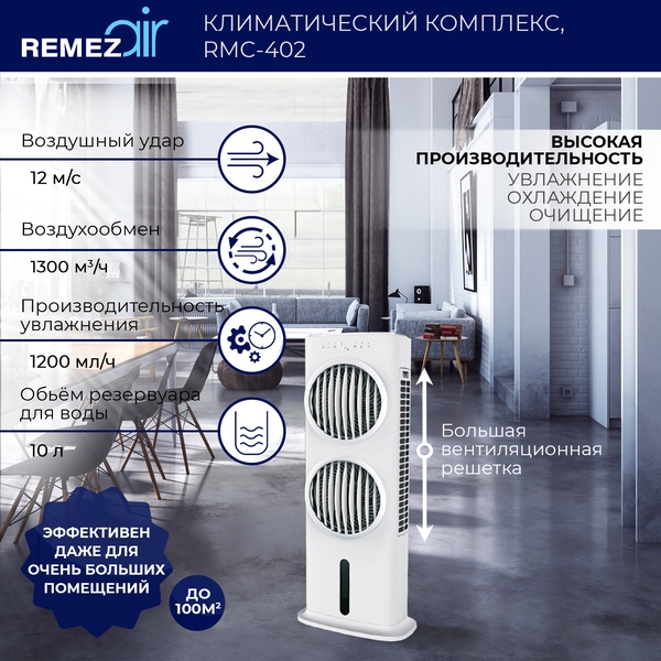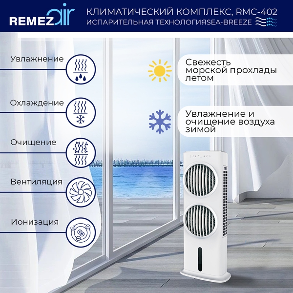 Климатический комплекс 5 в 1 обеспечивает эффективное естественное охлаждение, увлажнение, очищение, вентиляцию и ионизацию воздуха в помещениях до 100м2. Оптимален для круглогодичного использования.