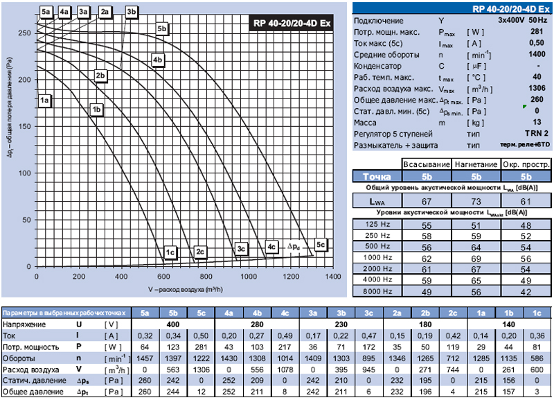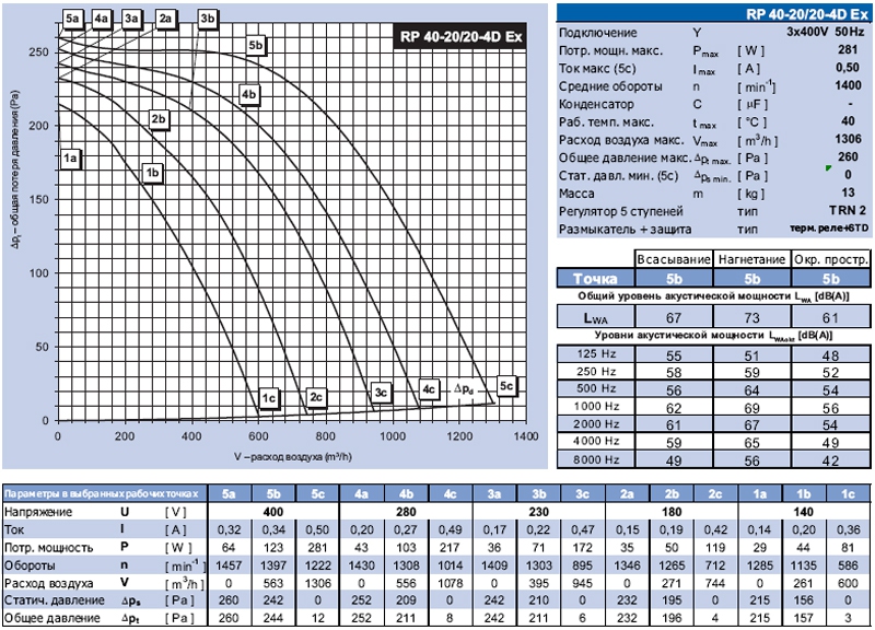 Ступенчатыми регуляторами напряжения ТRN можно регулировать производительность вентилятора на пяти ступенях с шагом примерно 20%, чему соответствует пять кривых зависимости давления и производительности на графике рабочих характеристик каждого вентилятора.