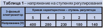 Электромоторы вентиляторов RР могут эксплуатироваться в пределах от 25% до 100% номинального напряжения. В табл.1 представлена зависимость