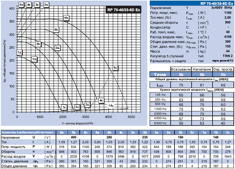 Ступенчатыми регуляторами напряжения ТRN можно регулировать производительность вентилятора на пяти ступенях с шагом примерно 20%, чему соответствует пять кривых зависимости давления и производительности на графике рабочих характеристик каждого вентилятора.
