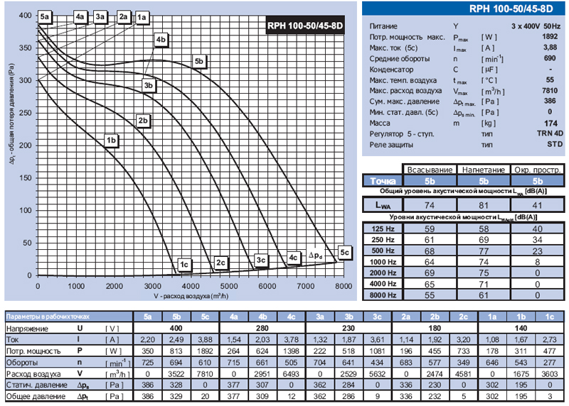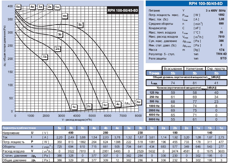 В табл. 4 указаны технические характеристики вентиляторов RРН в зависимости от макс, мощности, в одном столбце - в зависимости от макс, суммарного давления, а в другом - от макс, расхода воздуха. В большинстве случаев важнее знать взаимное соотношение: расход воздуха-давление, чем максимальные значения отдельных величин. График 1 служит для быстрого выбора необходимого вентилятора и для взаимного сравнения вентиляторов RРН. На графике показаны только характеристики каждого вентилятора при номинальном напряжении, т.е. без регулятора или с регулятором, включенным на 5 ступень мощности. В разделе данных указаны все основные характеристики вентиляторов RРН. Шумовые параметры „уровень акустической мощности на всасывании" и „уровень акустической мощности на нагнетании" вентилятора измеряются согласно IS0 3743-2. Шумовые параметры „уровень акустической мощности в окр. простр." расчитываются по значению акустической мощности, измеренной согласно IS0 3743-2 у вентилятора без изоляции, а также величины шумоизоляции корпуса, измеренной согласно ЕN IS0 11546-1. Мощностные характе-ристики вентиляторов измеряются согласно нормам DIN 24 163 и АМСА Stапdart 210-74.