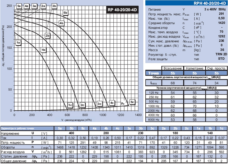В табл. 4 указаны технические характеристики вентиляторов RРН в зависимости от макс, мощности, в одном столбце - в зависимости от макс, суммарного давления, а в другом - от макс, расхода воздуха. В большинстве случаев важнее знать взаимное соотношение: расход воздуха-давление, чем максимальные значения отдельных величин. График 1 служит для быстрого выбора необходимого вентилятора и для взаимного сравнения вентиляторов RРН. На графике показаны только характеристики каждого вентилятора при номинальном напряжении, т.е. без регулятора или с регулятором, включенным на 5 ступень мощности. В разделе данных указаны все основные характеристики вентиляторов RРН. Шумовые параметры „уровень акустической мощности на всасывании" и „уровень акустической мощности на нагнетании" вентилятора измеряются согласно IS0 3743-2. Шумовые параметры „уровень акустической мощности в окр. простр." расчитываются по значению акустической мощности, измеренной согласно IS0 3743-2 у вентилятора без изоляции, а также величины шумоизоляции корпуса, измеренной согласно ЕN IS0 11546-1. Мощностные характе-ристики вентиляторов измеряются согласно нормам DIN 24 163 и АМСА Stапdart 210-74.